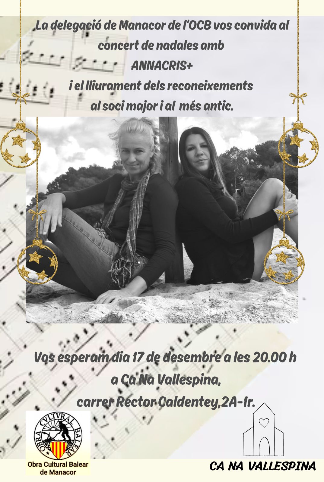 La delegació de Manacor de l'Obra Cultural Balear vos convida a un concert de nadales d'Annacris+. Durant l'acte es lliuraran reconeixements als socis major i més antic de la delegació de Manacor de l'OCB.