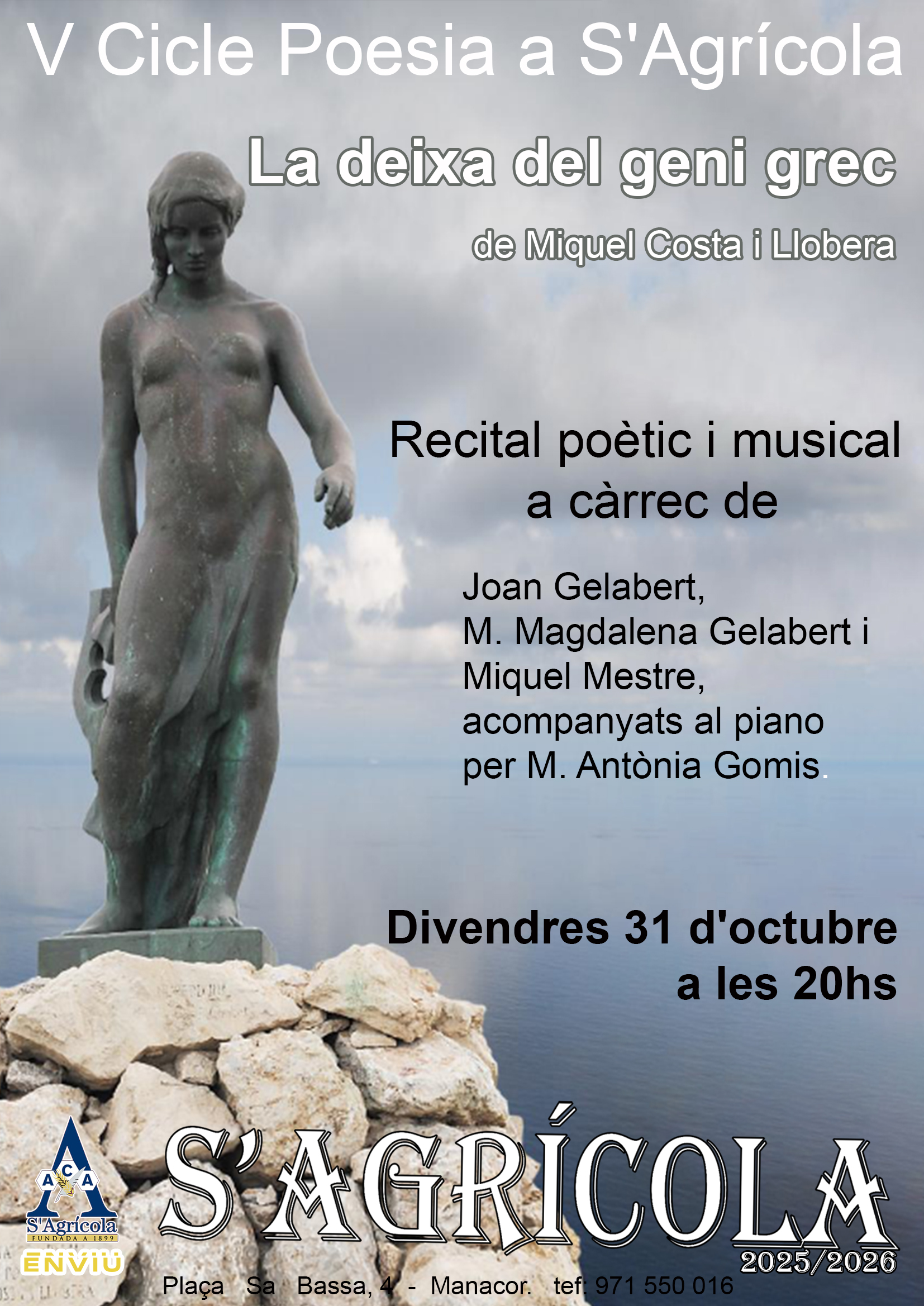 Enguany se celebra l'efemèride de la publicació de La deixa del geni grec, una de les obres més emblemàtiques de la literatura catalana de Mallorca, escrita per Miquel Costa i Llobera. És un poema èpic bellíssim titulat de La deixa del geni grec. Fantasia de les Coves d'Artà que beu de la influència del món hel·lènic, sobretot la poesia èpica d'Homer i l'Odissea, així com també de la poesia francesa i de la figura de Jacint Verdaguer. És una obra especialment destacada dins la trajectòria poètica de Miquel Costa i Llobera.