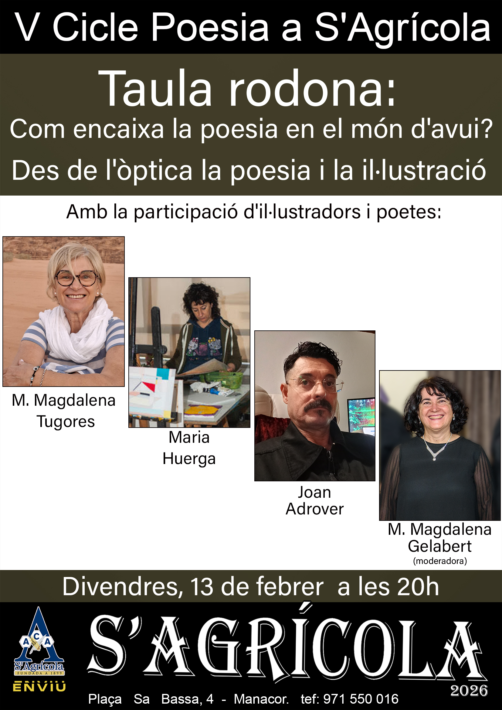 El segon acte previst per al V Cicle de Poesia a S'Agrícola és una taula rodona que pretén debatre sobre Com encaixa la poesia en el món d'avui? Des de l'òptica de la poesia i la il·lustració. Per això, divendres, 13 de febrer de 2026 a les 20h hi participaran diverses persones vinculades al món de la poesia i a la il·lustració d'avui: M. Magdalena Tugores, Maria Huerga i Joan Adrover. La moderadora serà M. Magdalena Gelabert.